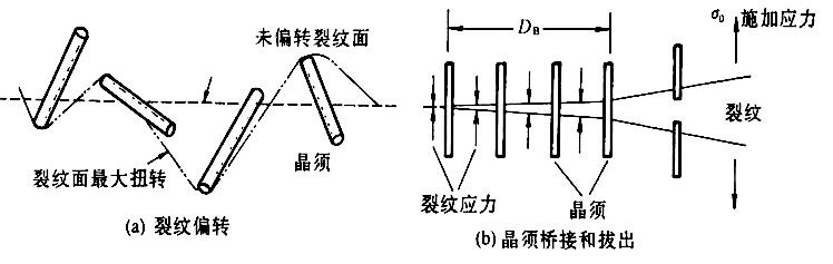 復合材料中存在的微裂紋也會導致主裂紋在擴展過程中發生偏轉,增加復合材料的韌性,其原理如(圖3,5)所示;裂紋橋聯可能發生穿晶破壞,也有可能出現裂紋繞過橋聯單元沿晶發展及偏轉的情況,其原理如(圖5)所示。