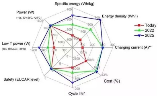 圖1 現有動力電池的技術指標以及未來10 年的發展目標