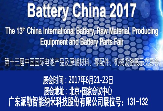 2017第十三屆中國國際電池產品及原輔材料、零配件、機械設備展示交易會將于2017年6月21—23日在北京國家會議中心舉行。廣東派勒智能納米科技股份有限公司邀您共襄盛會,派勒展位號:131-132。