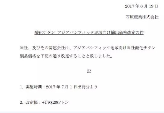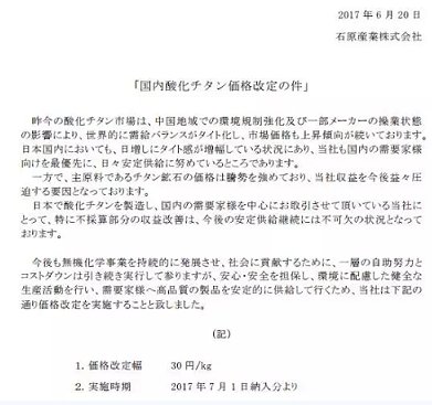 6月20日,石原又宣布自2017年7月1日起,在日本國內對鈦白粉產品進行漲價,漲價幅度為30日元/公斤。