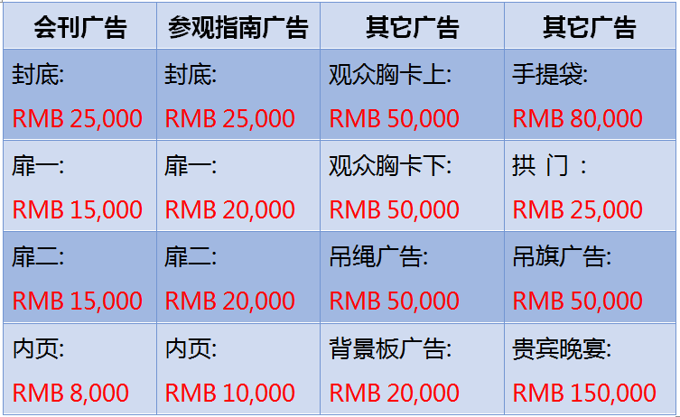 1、標準展位配置:提供三面圍板、洽談桌一張、 椅子兩把、中英文楣板,二盞射燈、220V/5A電源插座一個、展位鋪滿地毯;其他額外開支由展商承擔。