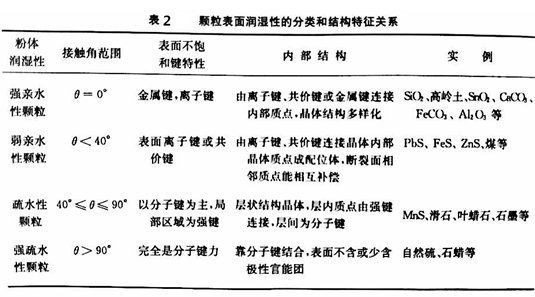 根據表面接觸角的大小,固體顆?煞譃橛H水性和疏水性兩大類,具體分類見表2。
