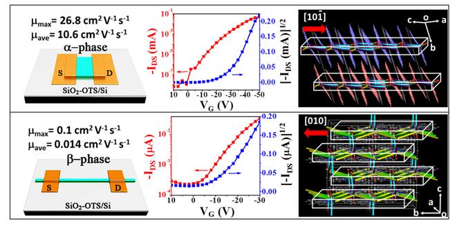 中國科學院化學研究所有機固體實驗室研究人員利用溶液過飽和度、氣相擴散溫度梯度、表面納米溝槽等誘導效應,對有機半導體晶相生長的熱力學和動力學過程進行調控,獲得了堆積結構緊密的單晶或晶態膜,表現出非常高的載流子遷移率。通過選擇不同的溶液濃度控制其過飽和度,首次可控地制備了硫雜并苯衍生物的不同晶相的單晶。β晶體(HOMO-1)能級之間的電子耦合作用明顯高于α晶體,并對電荷傳輸性能起主導作用,導致β單晶載流子遷移率高達18.9 cm2 V-1 s-1,證實了不同的堆積結構能造成非簡并(HOMO-1)能級電子耦合作用的顯著差異,從而對電荷傳輸產生重要的影響,為有機半導體堆積結構的調控提供了一種新的理念和思路(Adv. Mater. 2015, 27, 825)。