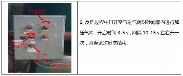 可用反沖洗的方法來進行清洗。利用逆向進水,同時通入壓縮空氣,進行氣水混合擦洗,使過濾器內砂濾層松動,可使粘附于石英砂表面的截留物剝離并被反沖水流帶走,有利于排除濾層中的沉渣、懸浮物等,并防止濾料板結,使其充分恢復截污能力,從而達到清洗的目的。