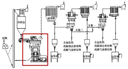 從重鈣粉體產品多樣化需求的角度考慮,在進行立式磨粉體工程系統設計時多采用“立式磨+二次(或三次)”分級工藝。原因有兩個:1.利用立式磨的規模化節能超細生產;2.利用二次分級有利于產品精細化提升。
