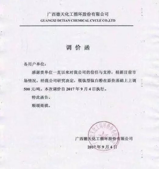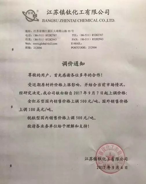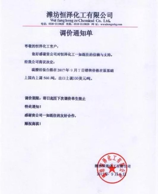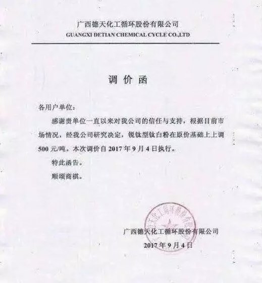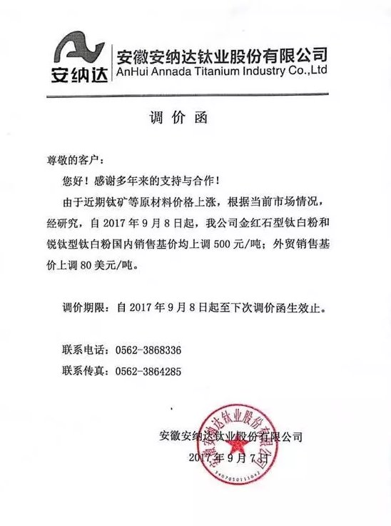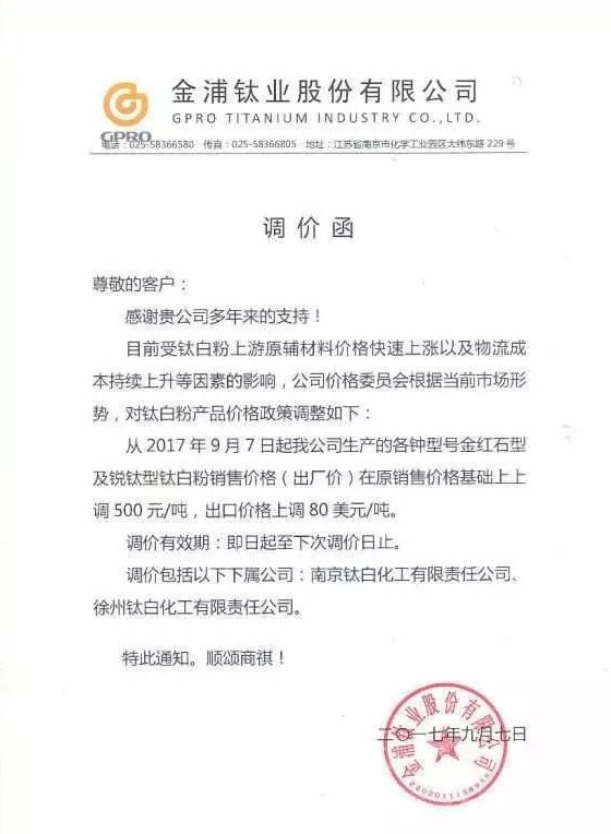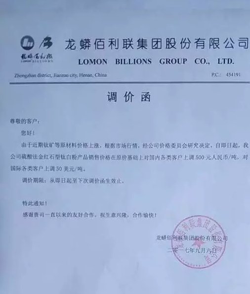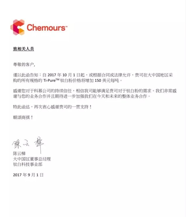 中國的粉體網訊 近日國外內鈦白粉企業紛紛漲價(漲價函),其中龍蟒佰利再次發布漲價通知,此輪漲價已是年內的第七次調價。國際巨頭科慕公司也發出鈦白粉提價公告。公告中稱,自10月1日起,科慕旗下所有規格的Ti-Pure™鈦白粉價格在中國大陸原有的基礎上上調150美元/噸(合計975元/噸)。