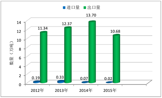 2012-2015年中國鱗片天然石墨進出口數量圖