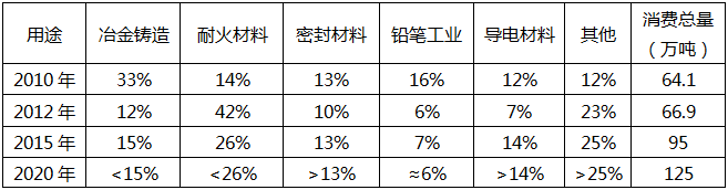 近年來, 隨著我國經濟結構調整, 石墨逐漸轉向新能源新材料領域的應用趨勢明顯, 包括導電材料(鋰電池、燃料電池等)、油品添加劑及氟石墨等其他領域的消費量將大幅度增加, 預計2020年這一比例將超過25%。