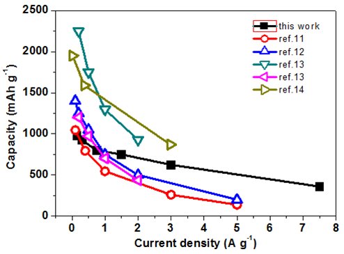 圖2.本研究工作的二維納米硅/二氧化硅復合負極材料與文獻報道的硅基負極材料的高倍率性能對比圖