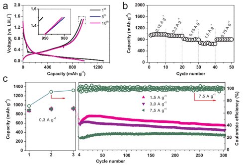中國科學院寧波材料技術與工程研究所動力鋰電池工程實驗室自2011年開展硅基負極材料的研究開發,已取得系列進展。2012年報道了一種三維多孔的納米硅/石墨烯復合負極材料。近日,又報道了一種新型二維納米硅/二氧化硅復合負極材料(2D nano-Si/SiO2)。該工作利用層狀結構CaSi2的拓撲轉變,在酸性溶液中化學剝離Ca原子(圖1a),留下單原子層褶皺狀硅烯,由于Si原子只存在sp3雜化,硅烯極不穩定,在水溶液中氧化得到亞穩態二維硅氧烯(圖1b),二維硅氧烯經過合適的熱處理條件脫水歧化得到二維納米硅/二氧化硅復合負極材料(2D nano-Si/SiO2),其中納米硅均勻分散于無定型硅氧化物(圖1c)。二維結構可有效減少鋰離子遷移路程,納米硅和硅氧化物可有效降低了體積膨脹率,因此采用該方法制備的2D nano-Si/SiO2@C表現出優異的循環穩定性和倍率性能。電化學性能測試表明,在0.15A/g條件下,首次放電容量大于950mAh/g,在7.5A/g的大電流密度下,放電容量達360mAh/g,相比于文獻已報道的硅或硅氧化物材料,倍率性能具有顯著優勢(圖2);在1.5,3.0和7.5A/g的大電流密度下,循環300周容量保持率分別為73%,73%和92%(圖3)。該新型2D nano-Si/SiO2C負極材料,有望應用于長續航電動汽車(圖4)。