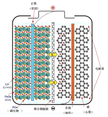 磷酸鐵鋰是一種橄欖石結(jié)構(gòu)的聚陰離子磷酸鹽,其充放電反應(yīng)是在磷酸鐵鋰和磷酸鐵兩相間進(jìn)行的。充電時,Li+ 從LiFePO4中脫離出來,F(xiàn)e2+ 失去一個電子變成 Fe3+;放電時,Li+ 嵌入磷酸鐵中變成 LiFePO4 。