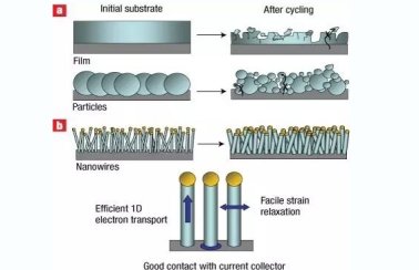 2008年,崔屹提出用納米級硅線作為硅負極,這樣可以減緩導致體相硅負極瓦解的壓力和應力。這條思路果然奏效,在經過10輪充放電循環后,負極仍具有75%的理論儲能量。
