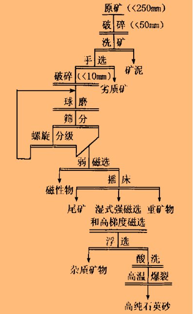 關于用脈石英或石英巖礦石生產(chǎn)高純石英砂的可行性,有學者對江西巋美山的脈石英礦石作了小型試驗和半工業(yè)試驗。