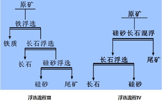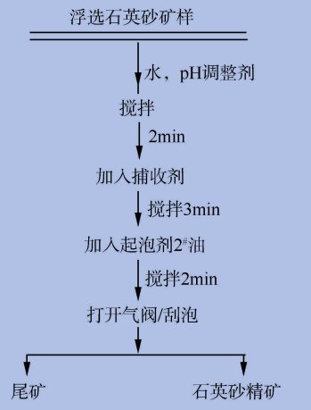 浮選除去石英中的伴生礦物長石與云母最典型的工藝流程是以氫氟酸為活化劑,在強酸條件下( pH=2~3) 采用胺類陽離子捕收劑進行浮選。但隨著環(huán)保意識的增強,現(xiàn)在多采用無氟浮選。