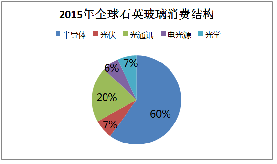 據石英行業協會報告,2015年全球石英玻璃市場規模超過200億元,從全球市場來看,光纖、半導體等高端應用領域市場占主導,合計需求占比約80%。