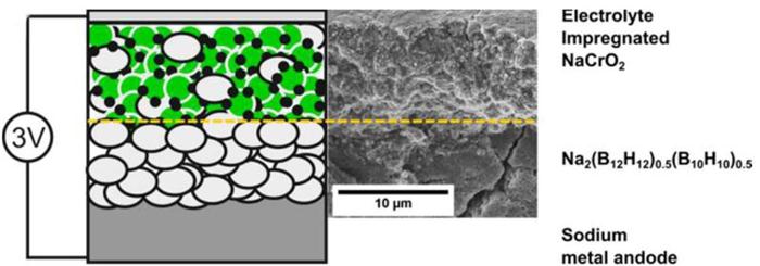 研究人員將部分電解質溶解于溶劑中,然后加入了亞鉻酸鈉(NaCrO2)粉末。當溶劑蒸發后,將陰極、電解質及陽極堆疊后,將各層壓緊后形成該款固態鈉電池。