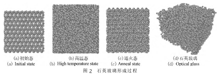 在室溫下,隨著溫度的提高,系統(tǒng)中原子的熱運動加劇,導(dǎo)致原子間作用加劇,體系發(fā)生膨脹。到1 300 K時,系統(tǒng)體積變化基本不變,石英晶體發(fā)生一級相變。在系統(tǒng)模擬溫度到達約4 200 K時,系統(tǒng)體積急劇增加,此時發(fā)生了二級相變,形成了高溫態(tài)結(jié)構(gòu)。在系統(tǒng)溫度達到5 000 K后,對系統(tǒng)進行退火處理,直至溫度達到室溫,最終得到非晶態(tài)石英玻璃模型。
