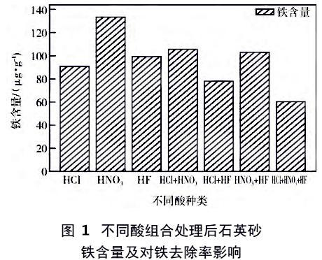 結果表明,三元混酸酸洗除鐵效果最好。其中,鹽酸具有良好的金屬溶解能力,且對鐵離子有絡合性;硝酸能有效的氧化金屬元素生成可溶性鹽,但單獨使用時效果欠佳;氫氟酸對二氧化硅、云母、長石等都具有明顯的溶蝕作用,加入氫氟酸可明顯提升除鐵效果;混酸酸洗可產生協同效應,有利于提高雜質去除效率。