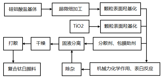 粒-粒包覆改性法是強力機械研磨法生產復合鈦白粉的改進工藝,該法以碳酸鈣、高嶺土、煅燒高嶺土和重晶石等白色礦物粉體為包核基體,結晶TiO2(銳鈦礦型和金紅石型)為包膜物,采用白色礦物粉體濕法超細研磨和白色礦物粉體與結晶TiO2濕法共混研磨途徑,通過固體顆粒的分割細化、表面羥基化改造和機械力化學效應導致的粒-粒包覆改性反應等方式制備而成。