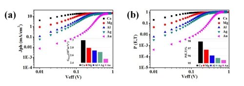 圖1.(a)不同陰極功函數電池的Jph隨Veff的變化曲線,插圖為對應電池的Gmax值(b)不同陰極功函數電池的P(E,T)隨Veff的變化曲線,插圖為在短路電流狀態下,對應電池的P(E,T),