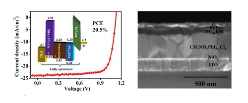 圖2.鈣鈦礦太陽電池IV曲線和能帶結構示意圖(左),鈣鈦礦太陽電池截面的SEM圖(右)