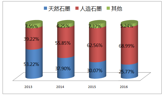 天然石墨和人造石墨負極材料性能不同,在實際應用中也會產生較大差別。根據最近幾年負極材料市場結構和產量結構的變化可以看出,2013年,中國負極材料市場天然石墨占據主導。2014年以后,在負極材料市場的爭奪中,更適用于動力電池的人造石墨市場占比超過天然石墨,并且逐年遞增。