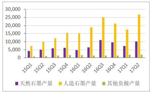預計未來幾年,受新能源汽車應用影響,人造石墨占比將繼續上升:目前國內新能源汽車鋰電池所采用的負極材料大多使用人造石墨,新能源汽車在國家政策的扶持下呈爆發式增長階段,帶動動力電池的大幅增長,未來幾年動力電池將是拉動人造石墨產量大幅上升的主要引擎。