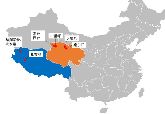 中國鹽湖主要分布在青海和西藏。目前我國擁有 1500 多個鹽湖,主要分布在青海和西藏。其中已開發碳酸鋰資源的為青海的察爾汗鹽湖、一里坪鹽湖、東臺吉乃爾鹽湖、西臺吉乃爾鹽湖、大柴旦鹽湖,以及西藏的扎布耶鹽湖、西藏阿里地區的結則茶卡鹽湖和龍木錯鹽湖。各個鹽湖的儲量不同,其中以察爾汗鹽湖為首,儲量約 718 萬噸碳酸鋰,其次為西藏的扎布耶鹽湖,儲量約 217 萬噸碳酸鋰。