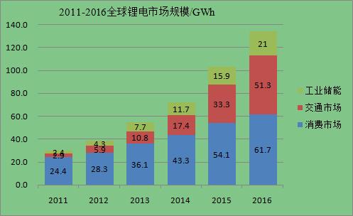 由上圖可以看出對于全球鋰電市場而言,交通市場的增速最快,2016年同比增長54%,消費市場和工業儲能同比增長14%和32%。近年來新能源汽車的迅速發展功不可沒。