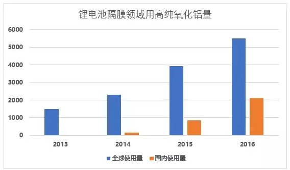 2014—2016年全球和國(guó)內(nèi)鋰電池隔膜領(lǐng)域用高純超細(xì)氧化鋁用量的復(fù)合增長(zhǎng)率分為54%和256%,國(guó)內(nèi)市場(chǎng)面臨爆發(fā)式增長(zhǎng)。