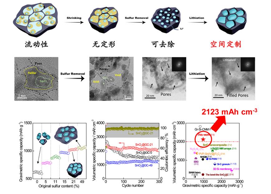 楊全紅教授研究團隊聯合清華大學、國家納米中心和日本國立材料研究所的合作者在最新的研究中有效地解決了這一問題。基于石墨烯界面組裝,發明了對致密多孔碳籠精確定制的硫模板技術。他們將非晶形硫和SnO2納米顆粒包埋在還原的氧化石墨烯水凝膠中,然后采用毛細蒸發技術來消除空隙,形成緊密的石墨烯網絡。除硫后,仍留有緩沖空間,生成一種可使SnO2完全膨脹的材料。通過簡單地控制硫的量來確定可用的緩沖空間,實現對非碳活性顆粒大小“合身”的包覆。這種方式適用于任何其他非碳陽極材料,并且在以碳籠結構作為電化學反應框架的能量存儲裝置中,是低體積能量密度的理想補救,而不是僅限于鋰離子電池。