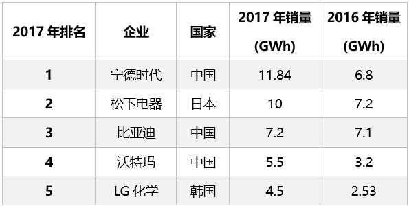 2017年,寧德時代打敗松下、比亞迪,以11.84 GWh的銷量成為全球動力電池銷量冠軍。