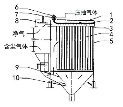 1-上箱體;2-噴吹嘴;3-花板;4-濾袋;5-中箱體; 6-脈沖閥;7-氣包;8-提升閥;9-導流擋風板;10-灰斗
