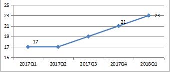 圖表1 2017Q1-2018Q1三元材料市場均價格走勢(萬元/噸)