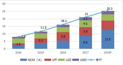 圖表3 2014-2018年中國不同類型正極材料產量及預測(萬噸)