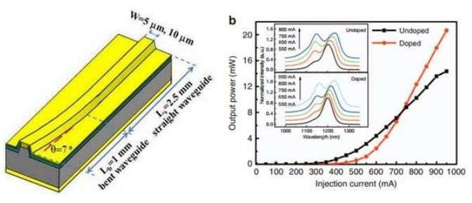 圖1 調(diào)制摻雜自組織量子點J型波導SLD結(jié)構(gòu)示意圖、光譜和P-I曲線