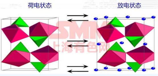 充電時,鋰離子從FeO6層面間遷移出來,經過電解液進入負極,發生Fe 2+→ Fe 3+的氧化反應,為保持電荷平衡,電子從外電路到達負極。放電時則發生還原反應,與上述過程相反。即: