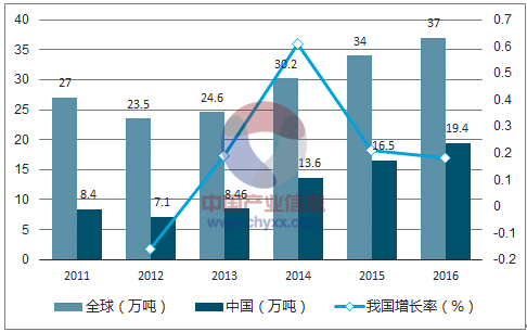 2011-2016 年我國(guó)多晶硅產(chǎn)量、增長(zhǎng)率及全球多晶硅產(chǎn)量