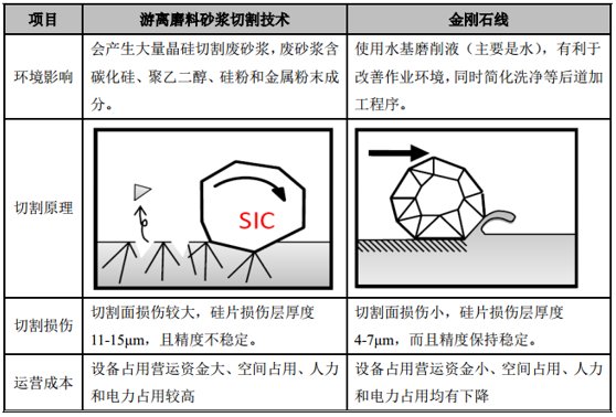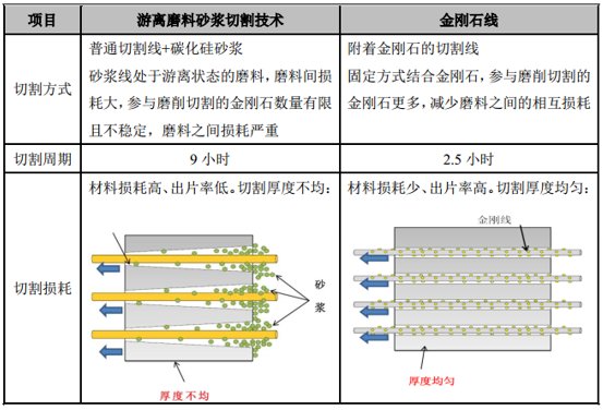 由上圖可見(jiàn),近年來(lái)光伏企業(yè)競(jìng)爭(zhēng)加劇,晶硅光伏組件價(jià)格一路走低,這對(duì)硅片生產(chǎn)、加工企業(yè)提出了進(jìn)一步壓縮成本的要求。金剛石線切割法作為新的切割技術(shù),具有薄片化切割、減小切口損失、降低硅料損耗、提高加工效率、提高出片率、降低污水及 COD 排放等優(yōu)勢(shì),可以大幅降低硅片生產(chǎn)企業(yè)成本,提高硅片品質(zhì),下圖為金剛石線切割和砂漿切割方式對(duì)比。