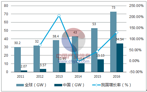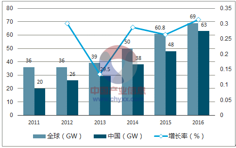 2011-2016 年我國(guó)光伏新增裝機(jī)量、增長(zhǎng)率及全球新增裝機(jī)量