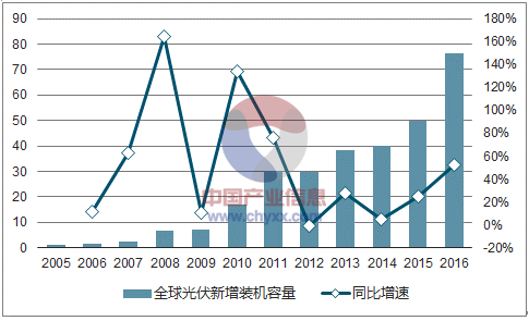 2016年全球光伏新增裝機(jī)容量達(dá)76.6GW,同比增長(zhǎng)52.9%