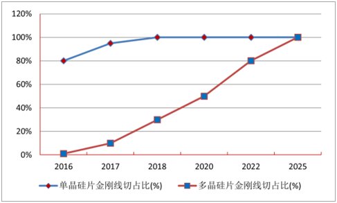 2、金剛石線切割技術(shù)對(duì)游離磨料砂漿切割技術(shù)的替代情況