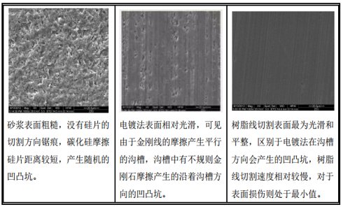 砂漿法、電鍍線法和樹(shù)脂線法切割硅片的表面效果圖