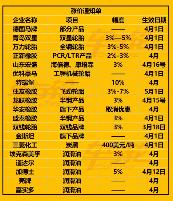 在原材料價格漲價的情況下,不少輪胎企業發布了4月份的漲價:
