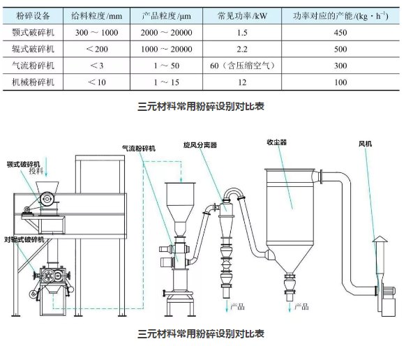 常見的三元材料工藝流程是:鄂式破碎→輥式破碎→氣流粉碎。需要注意的是pH值大于10,屬于堿性物質,粉碎設備需要耐堿腐蝕、耐磨損。