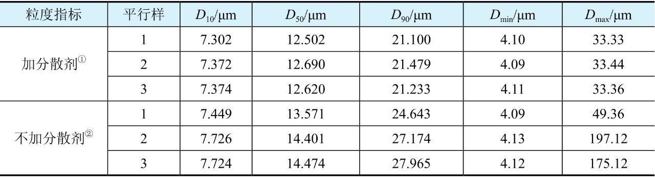 由表中測試結果可知,在保證其他測試條件一致的情況下,樣品分散時使用分散劑,三次平行測試結果的一致性好;不使用分散劑時,三次測試結果偏差較大,尤其是Dmax。由此可見,樣品分散時不加分散劑,樣品在水中出現團聚現象,導致Dmax很大而且不均。
