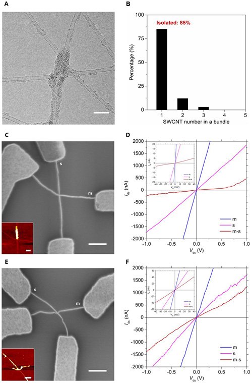 圖1. 單根分散、具有碳焊結構的SWCNT網絡。(A)典型TEM照片;(B)單根SWCNT的百分含量統計;(C-D)無碳焊結構的金屬性-半導體性SWCNT的I-V傳輸特性;(E-F)有碳焊結構的金屬性-半導體性SWCNT的I-V傳輸特性。