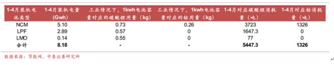 謝鴻鶴團隊根據(jù)網(wǎng)裝機電量,對今年1-4月新能源汽車消耗的鈷和鋰進行了測算,