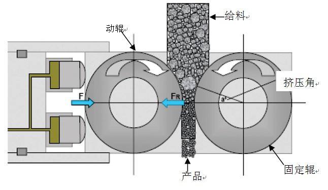 高壓輥磨機是利用高擠壓力作用使粒群層壓破碎原理而設計的。擠壓力是通過兩個直徑相等、轉速相同且相向旋轉的輥子相互擠壓而產生的。其中一個輥子為定輥,另一個為可以前后水平小幅度移動的動輥,壓力通過高壓油缸加在動輥兩端的軸承座上。