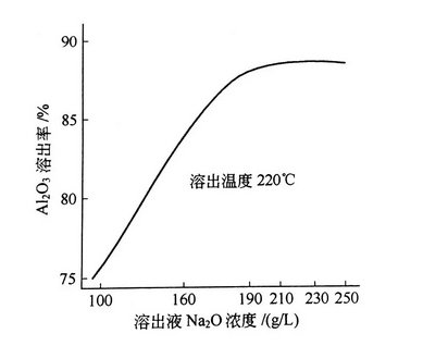 圖中是溶出溫度為220℃時堿溶液濃度對澳大利亞韋帕礦溶出率的影響,可以看出增大堿濃度對氧化鋁的溶出率有一定的影響。